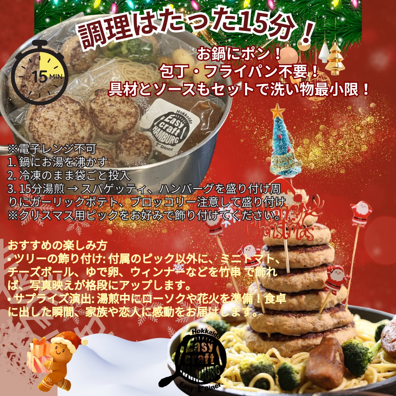 1. 感動のツリー: 聖夜を彩る、高さ約15cmの8段ハンバーグツリー! サイズ違いのハンバーグ8個使用で、積み重ねるだけで完璧なツリー形状に。クリスマス用ピックと花火も付属し、飾り付けも完璧です。